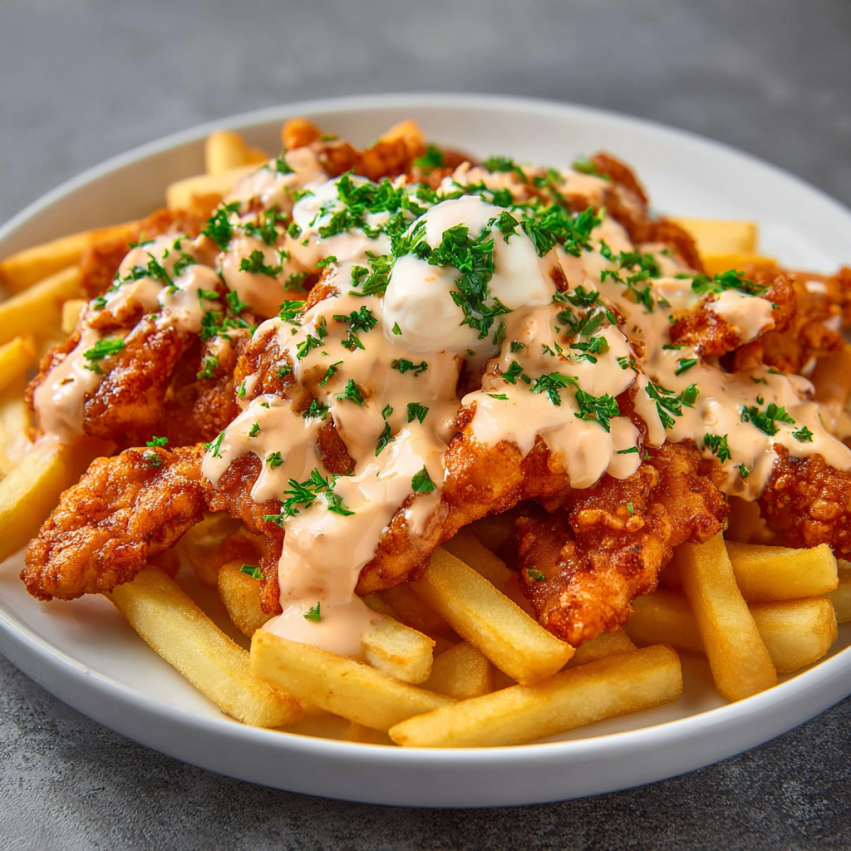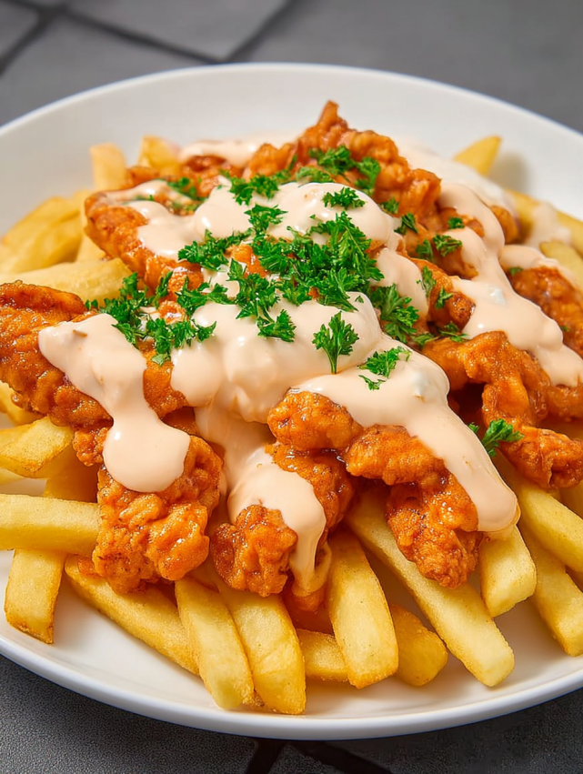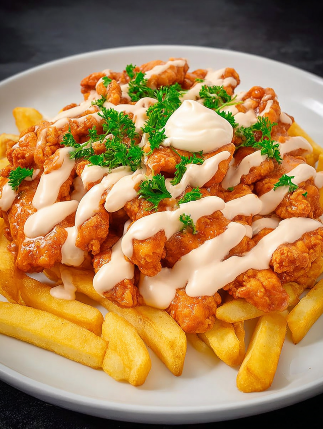 Krok 5: Teraz nadchodzi najlepsza część – składanie całego dania! Na talerzu ułóż gorące frytki, następnie rozłóż na nich kurczaka w sosie buffalo. Na koniec polej wszystko kremowym sosem i udekoruj świeżą pietruszką. Twój protein-packed posiłek jest gotowy do delektowania się!