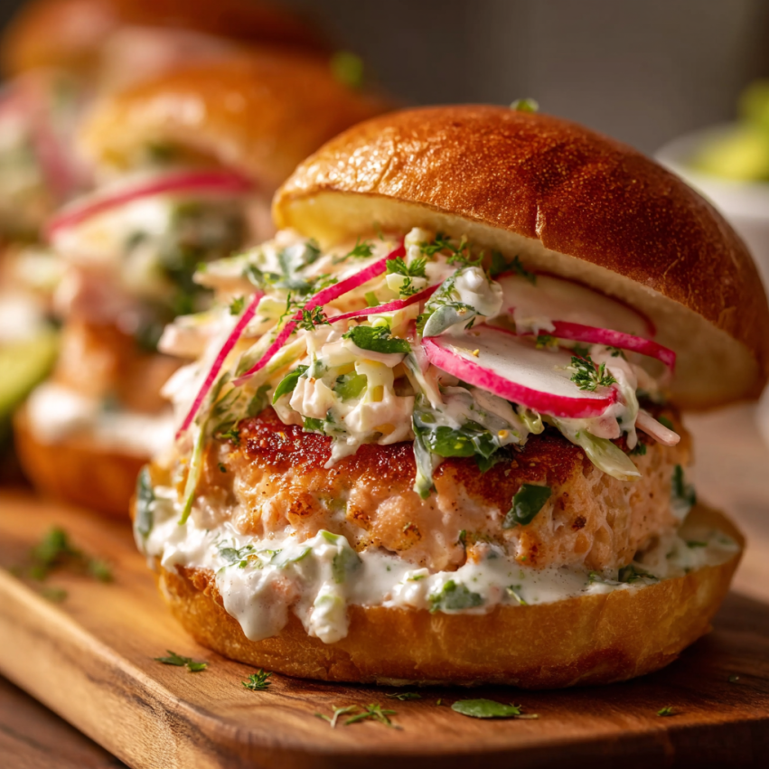 Burgery z Łososia z Chrupiącą Sałatką z Ogórka i Rzodkiewki
