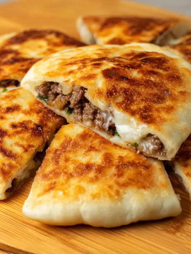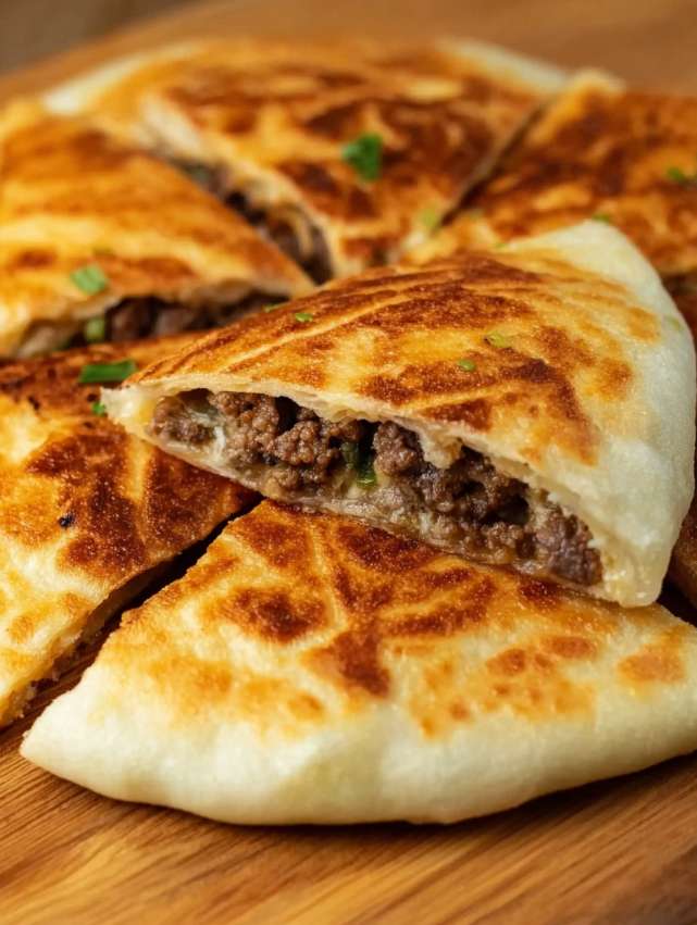 - Przygotuj bazę: Połóż jedną tortillę o średnicy 23 cm na czystej powierzchni roboczej. Posyp hojną warstwą tartej mozzarelli w centrum. Następnie nałóż farsz z wołowiną na ser i przykryj kolejną garścią sera. Nakryj drugą tortillą. Delikatnie dociśnij, aby się skleiło.