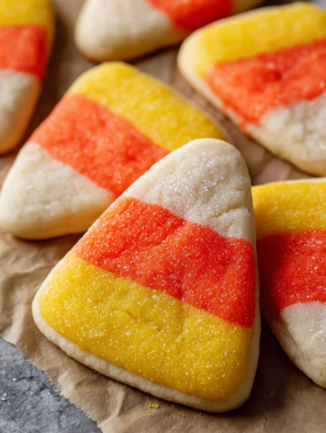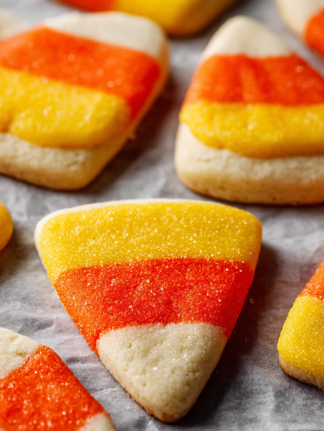Pokrój ułożone ciasto na paski szerokości około 8 mm, następnie pokrój każdy pasek na smukłe trójkąty przypominające kształt prawdziwego candy corn. Jeśli chcesz uzyskać dodatkowy chrup, obtocz każdy trójkąt w cukrze krysztale.