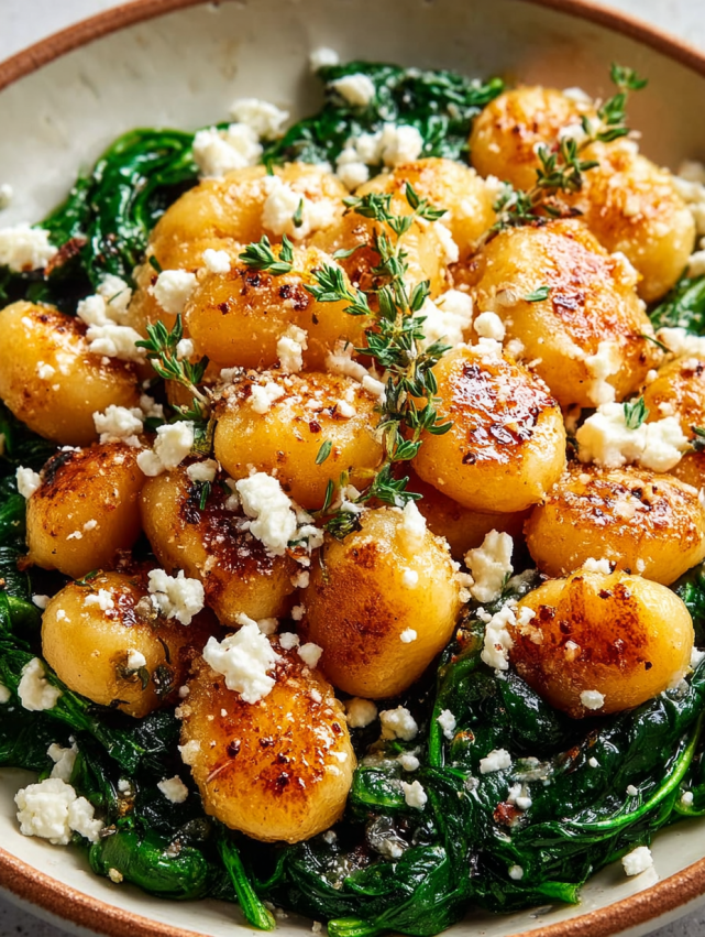Stir in the crumbled feta cheese, allowing it to distribute throughout the dish. The residual heat will warm the cheese and help it cling to the gnocchi and spinach. Serve immediately on individual plates while everything is still hot and the gnocchi are at their crispiest.