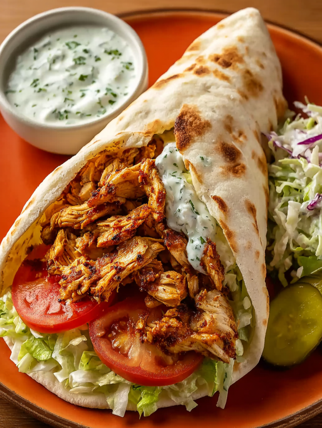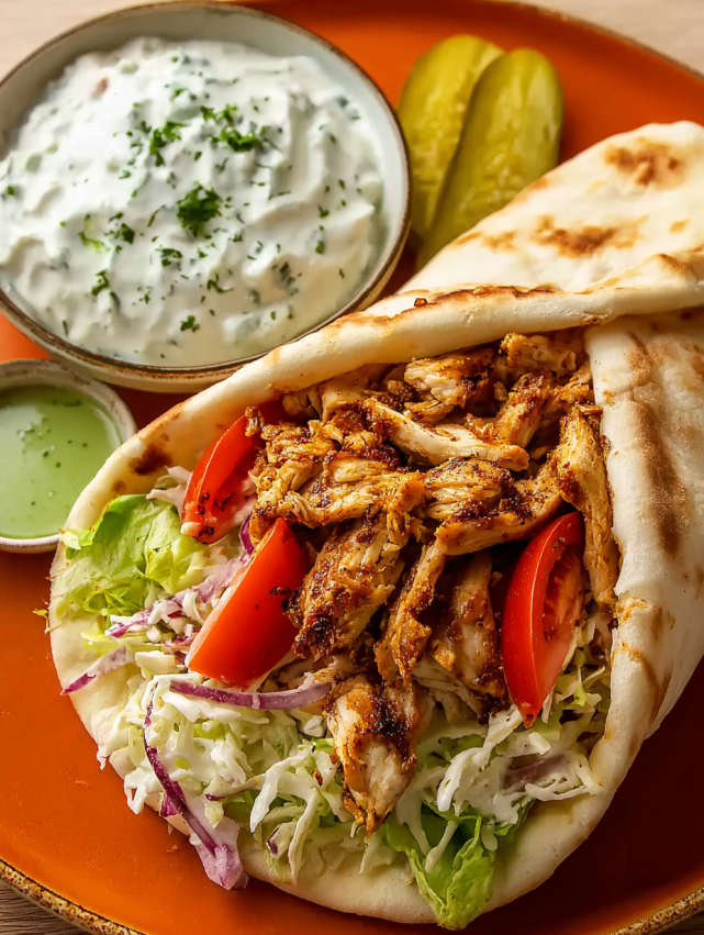 Ta wersja łączy w sobie wszystko, co najlepsze w shawarmi – delikatne mięso marynowane w aromatycznych przyprawach, świeże warzywa oraz kremowy sos z ogórków kiszonych, który idealnie równoważy intensywne smaki.