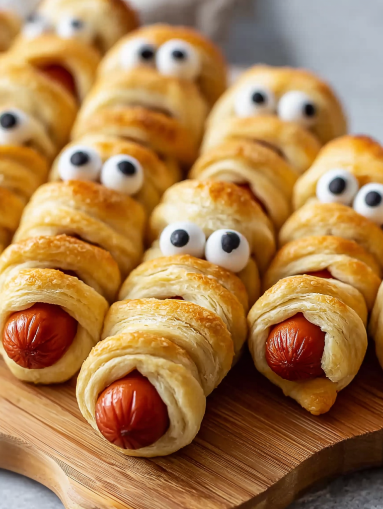 You can prepare these mummies several hours before your party, which significantly reduces last-minute stress. Wrap the hot dogs with pastry and arrange them on the baking sheet, then cover tightly with plastic wrap and refrigerate for up to 4 hours before baking.