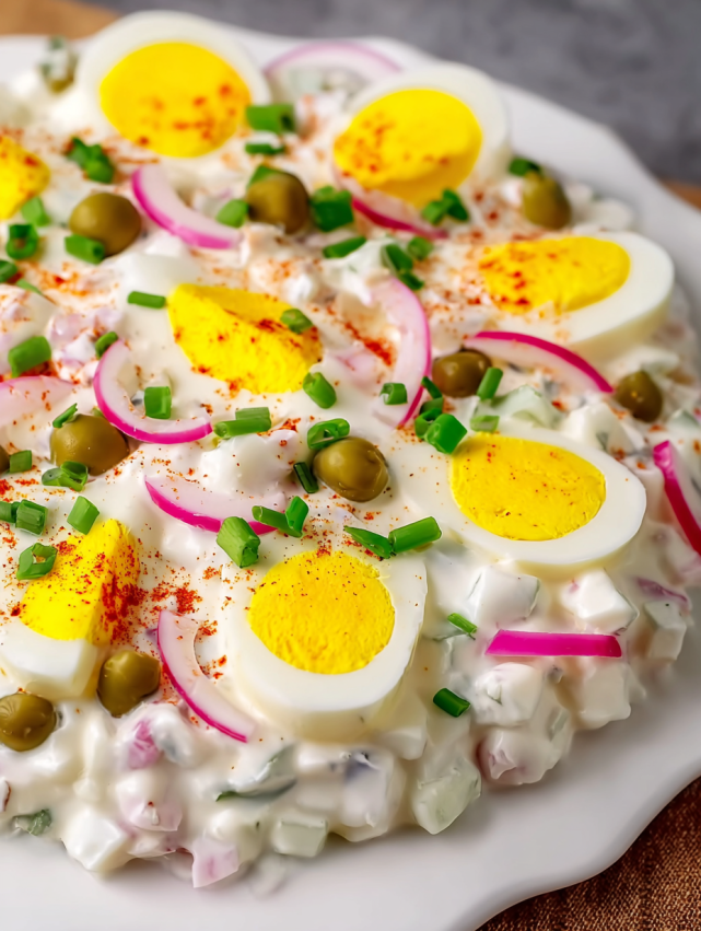 Połączenie chrupiących warzyw z delikatnym sosem jogurtowo-majonezowym tworzy harmonijną kompozycję smaków. Danie jest lekkie, ale jednocześnie sycące dzięki białku zawartemu w jajkach.
