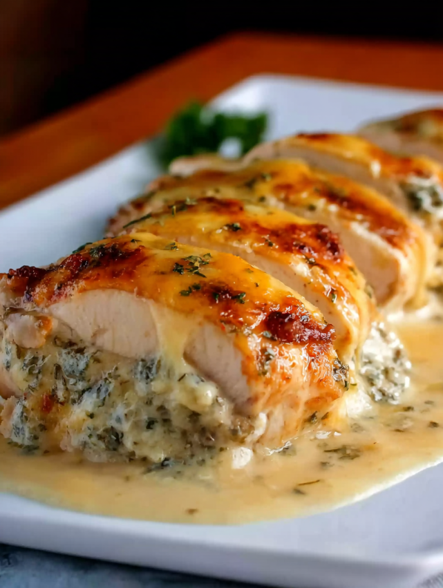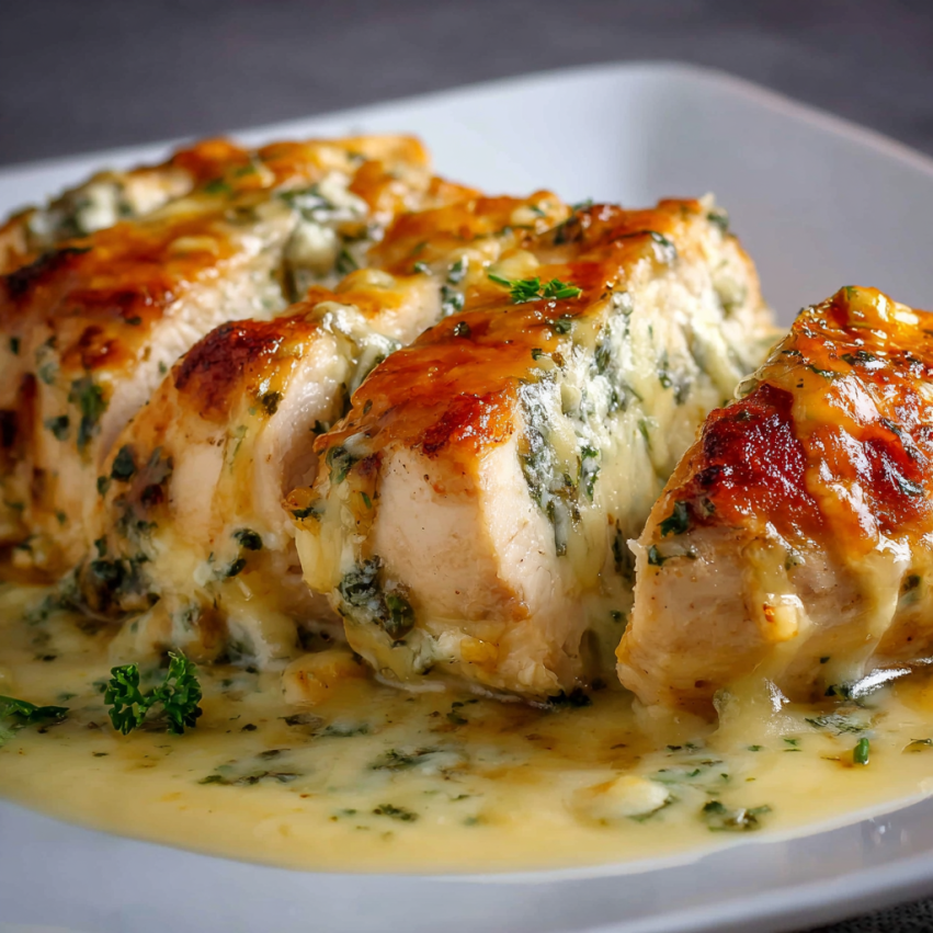 - Polej kurczaka przygotowaną mieszanką. Następnie ułóż plastry mozzarelli na wierzchu, lekko wciskając ser w sos.
