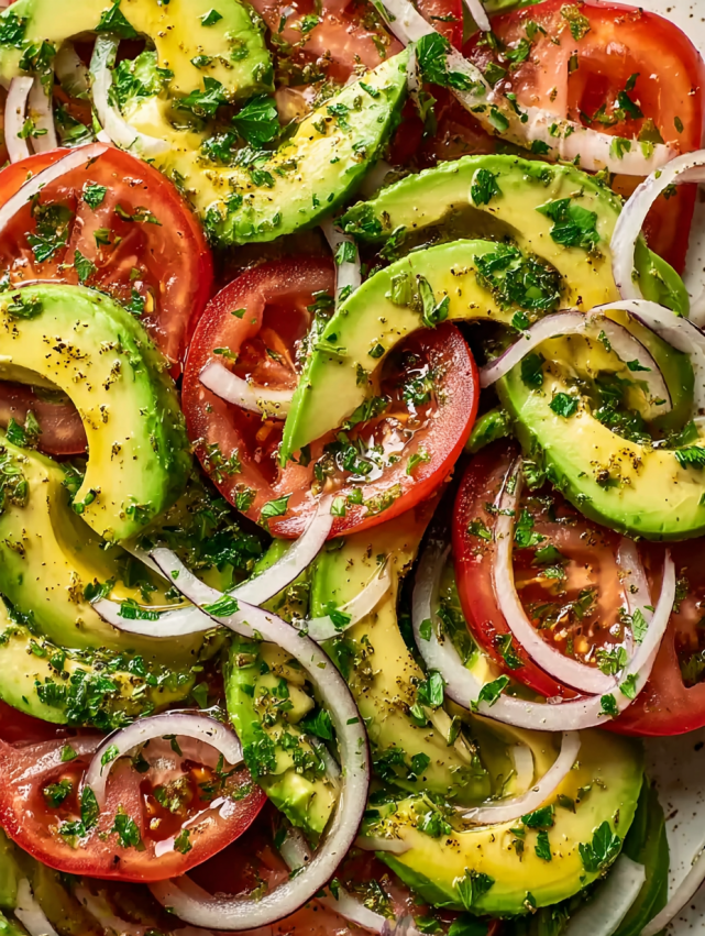 Na dużym talerzu lub półmisku ułóż plastry pomidorów, lekko nakładając je na siebie. Rozmieść równomiernie cebulę po całej powierzchni. Następnie dodaj plastry awokado, układając je między pomidorami w harmonijny wzór.