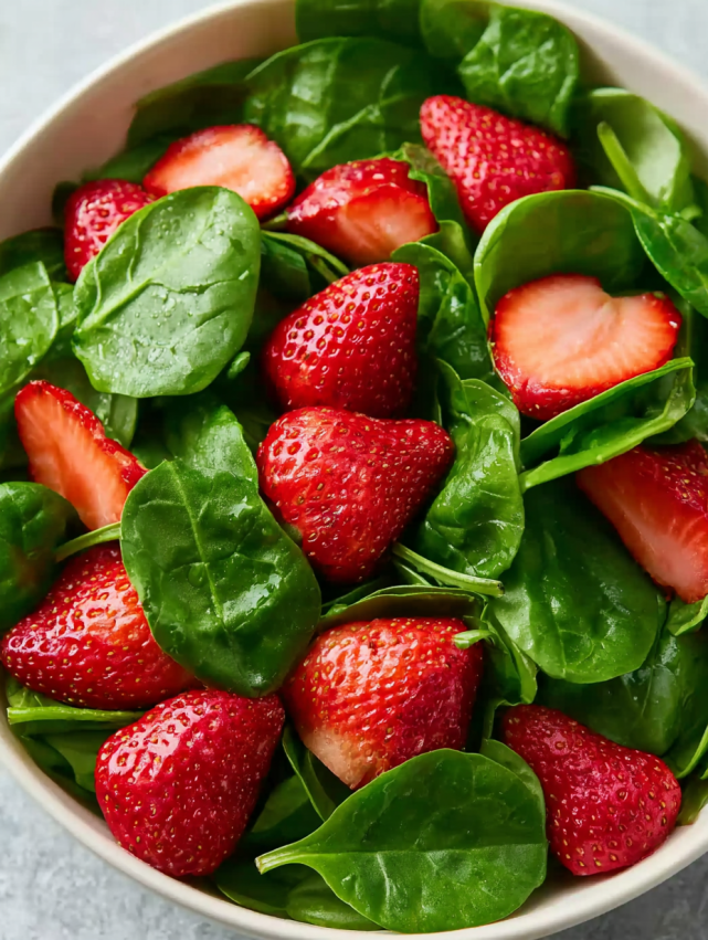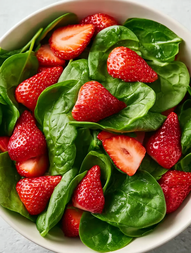 Słodkie truskawki kontrastują pięknie z delikatnie gorzkawym szpinakiem. Dodatkowo orzchy włoskie wnoszą chrupiącą teksturę, a ser feta dodaje kremowej słoności. Balsamiczny sos łączy wszystkie składniki w harmonijną całość.