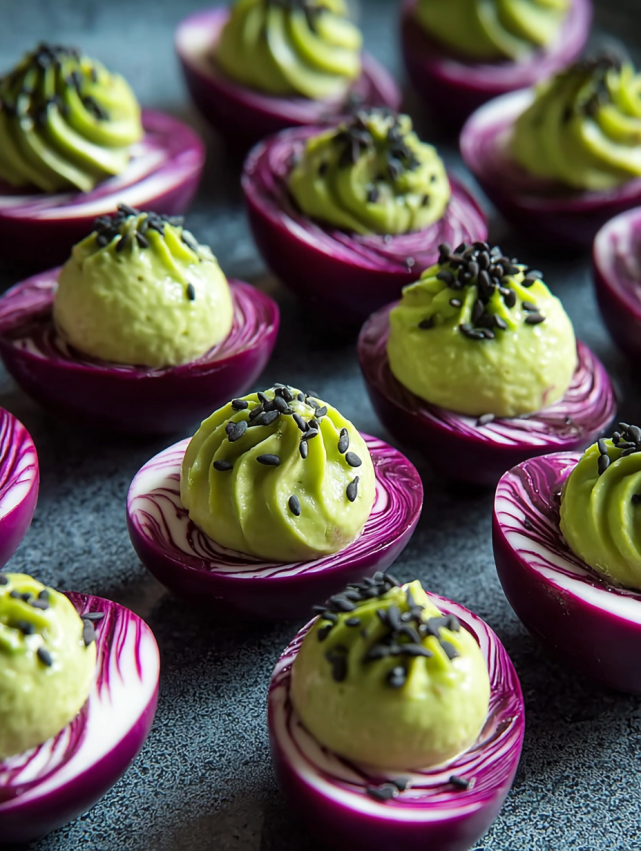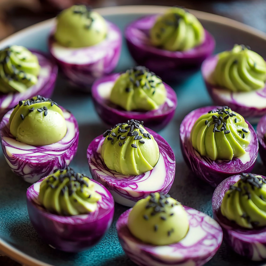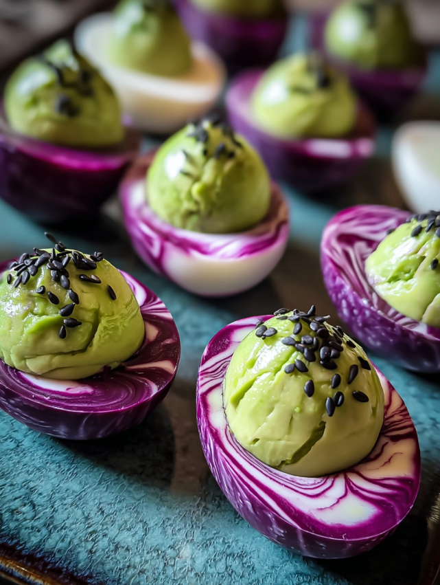 Presentation makes these eggs even more impressive. Arrange them on a dark slate or black serving platter to really make those purple swirls pop against the background. You can nestle them in a bed of dark leafy greens or surround them with decorative elements like small pumpkins and autumn leaves for a seasonal touch.