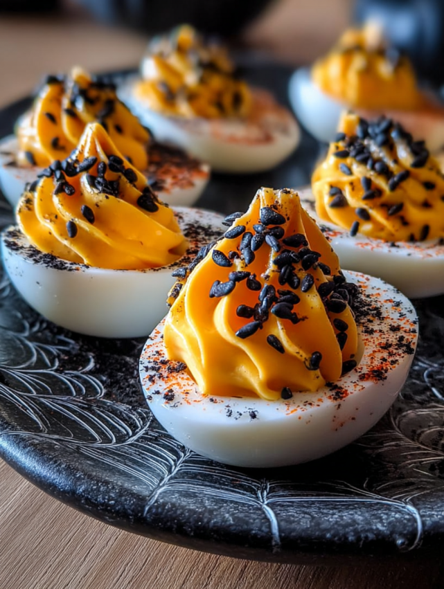 Spoon the yolk mixture back into the egg white cavities, mounding it slightly for a classic deviled egg look. Alternatively, use a piping bag with a star tip for a more elegant presentation. Finally, sprinkle your chosen garnish over the top—smoked paprika adds warmth, black sesame seeds amplify the spooky factor, and chives provide a fresh contrast.