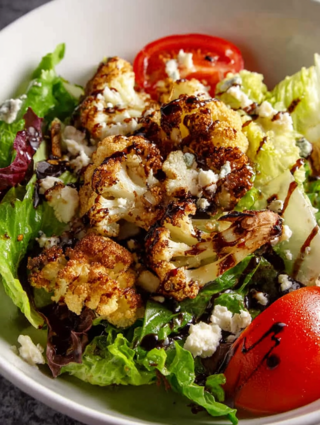 Ułóż przyprawiony kalafior na wierzchu przygotowanej sałatki i opcjonalnie posyp świeżymi ziołami. Podawaj od razu, gdy danie jest jeszcze ciepłe!
