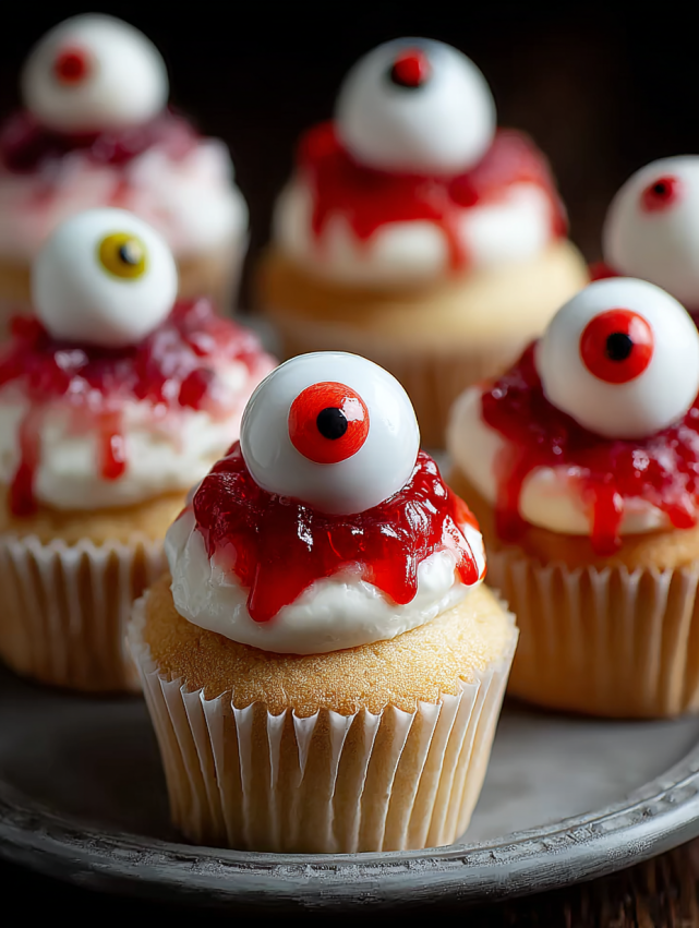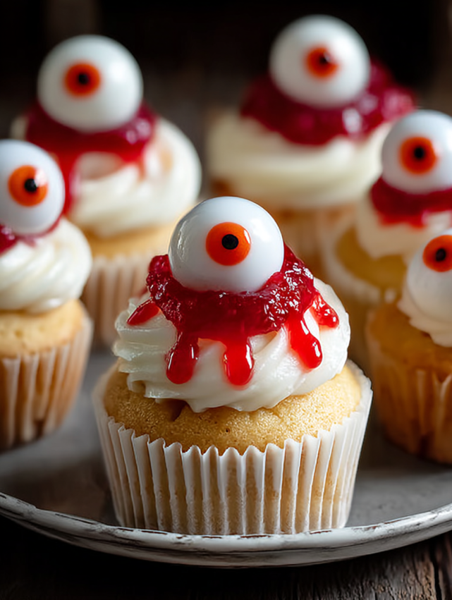 Krem najlepiej nakładać na babeczki tuż przed podaniem, aby zachować świeży wygląd. Jednak gałki oczne i żel można przygotować z wyprzedzeniem i przechowywać w lodówce.