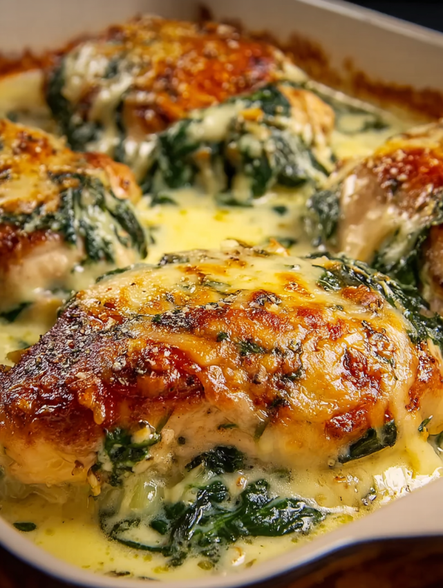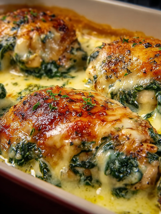 - Złóż danie i dokończ pieczenie: Wyjmij blachę z piekarnika. Rozłóż kremowy sos szpinakowy równomiernie na każdym udku i wokół ziemniaków. Wróć do piekarnika i piecz dodatkowo 35-40 minut, aż sos będzie bulgotać i lekko się zarumieni na wierzchu.