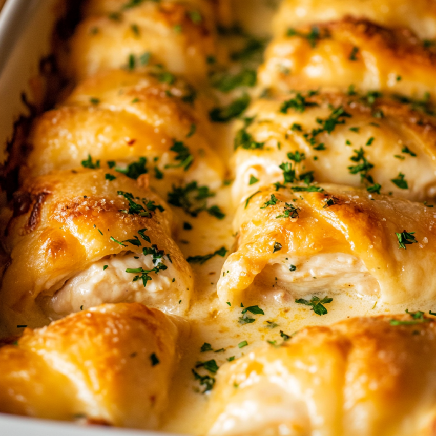 Rozgrzej piekarnik do 175°C. Wlej gorący sos serowy na roladki, upewniając się, że każda z nich jest całkowicie pokryta. Wstaw naczynie do piekarnika i piecz przez 30-40 minut, aż ciasto nabierze złocistego koloru, a sos zacznie bulgotać.